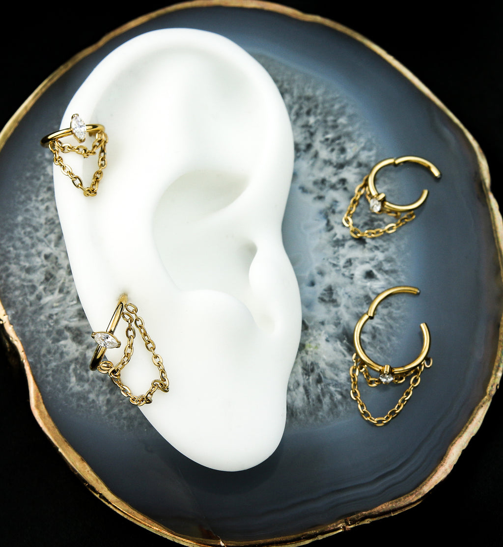 Made with gold pvd on 316L stainless steel, this hinged segment ring has a sparkling, clear CZ gem and a double dangle chain for added fun. Available in size 16G with either a 5/16" (8mm) or 3/8" (10mm) diameter size. For healed piercings, this ring is sold individually (1pc).