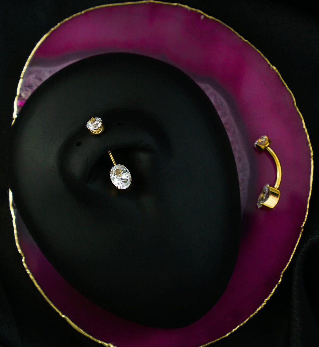 This golden, belly button has an oval-shaped, prong-set, clear cz gem on the bottom that measures about 7mm. On top there is a round, prong-set, 4mm clear cz gem. It is made with gold pvd on ASTM F-136 titanium and has an internally threaded design. It has a length of 3/8" (10mm). Sold individually.