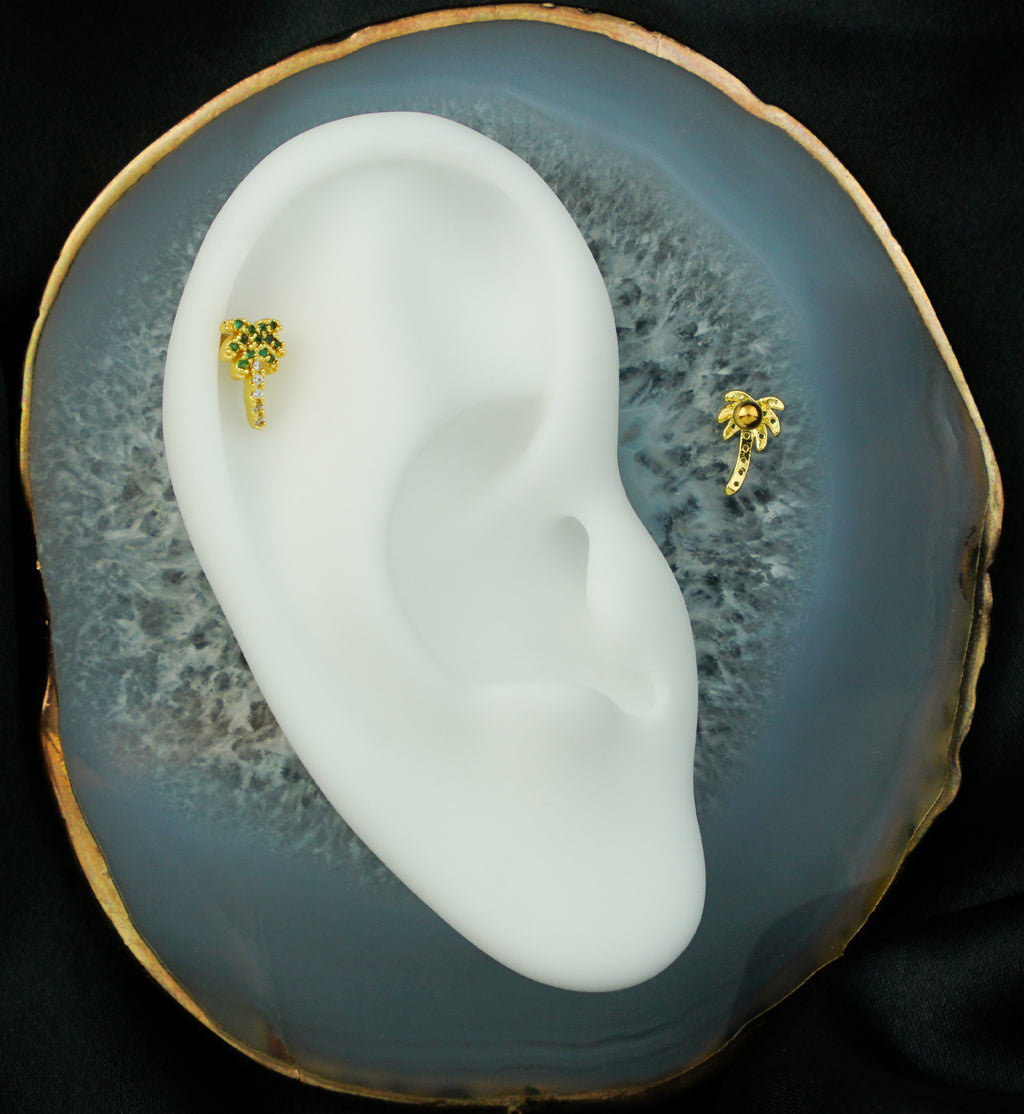 Golden stainless steel cartilage/tragus barbell with a palm tree design that is filled with green cz gems on top where the leaves are and clear cz gems in a row along the trunk. It is made from gold pvd on 316L stainless steel and is externally threaded. Great piece for cartilage or tragus piercings! Size is 16G with a bar length of 1/4" (6mm) with a 2.5mm externally threaded ball. Top size is 9mm x 5mm. Sold individually and is for healed piercings.