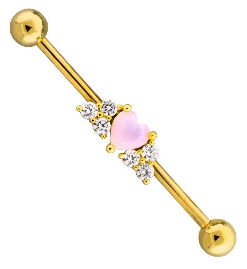 Gold PVD Pink Heart Clear CZ Stainless Steel Industrial Barbell