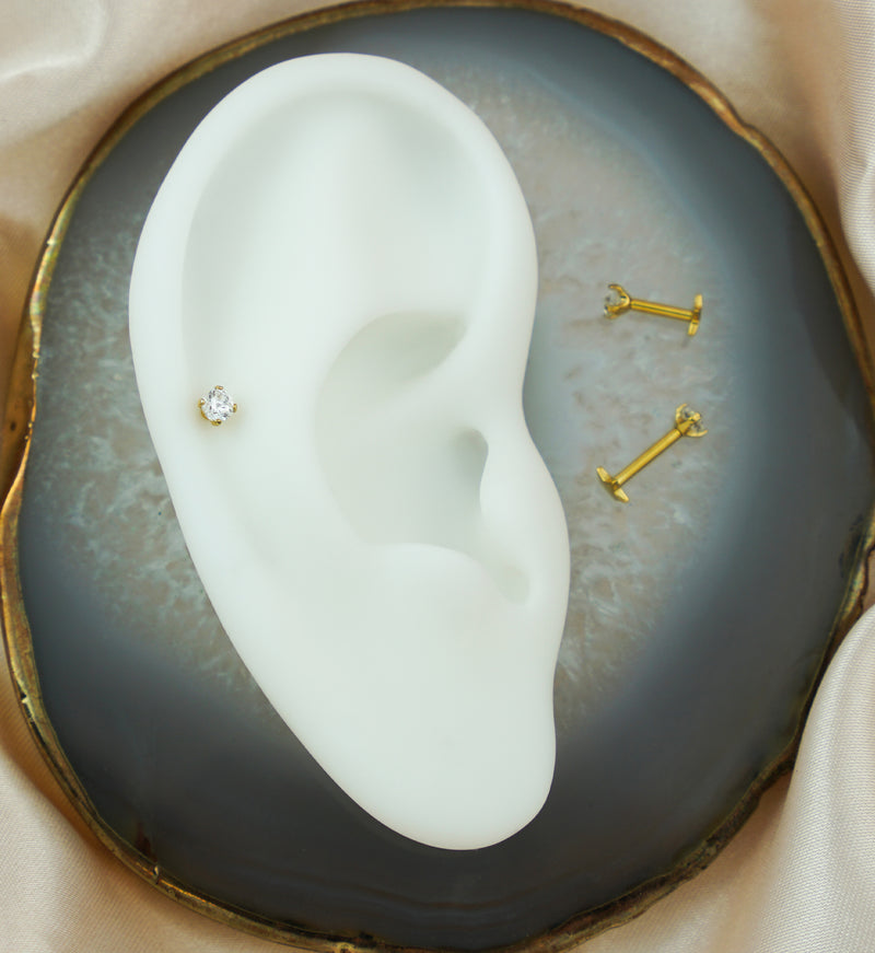Made from gold pvd on ASTM F-136 titanium, this titanium threadless labret has a prong set, round, clear cz gem on top with a convex star shaped disk. The cz gem measures 3mm. It is made from gold pvd on ASTM F-136 titanium and has a 25G pin and a 4mm convex, star-shaped, disk back. Sold individually, it is available in sizes 18G or 16G with either a 1/4" (6mm) or 5/16" (8mm) length. Fun labret piece for cartilage or tragus piercings!
