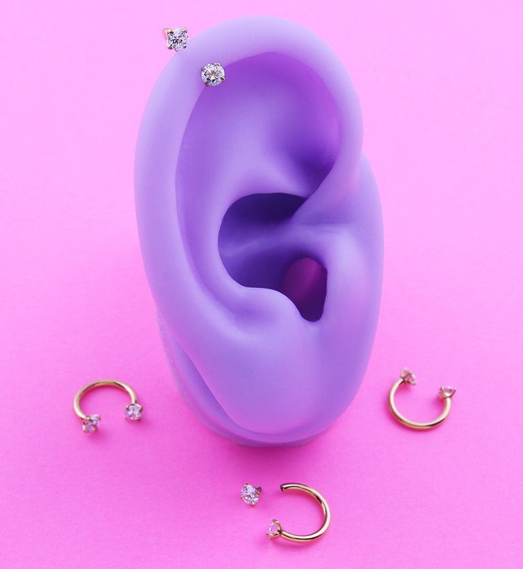 Golden, high-quality, titanium internally threaded circular barbell features a prong set, clear cz gem that is internally threaded on each side. Constructed with gold pvd on ASTM F-136 titanium for a durable and lightweight piece, the inner diameter measures 5/16" (8mm) with a size of 16G. Perfect for septum piercings!