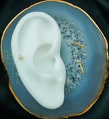This golden, internally threaded labret has a prong set, star-shaped, clear cz gem with a flat back. The disc on the end has a size of 4mm. For healed piercings. Size is 16G and you can pick from two different lengths: 1/4" (6mm) or 5/16" (8mm). The gem size on top is 3mm. It is made from gold pvd on ASTM F-136 titanium. Sold Individually (1 pc).