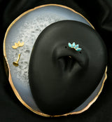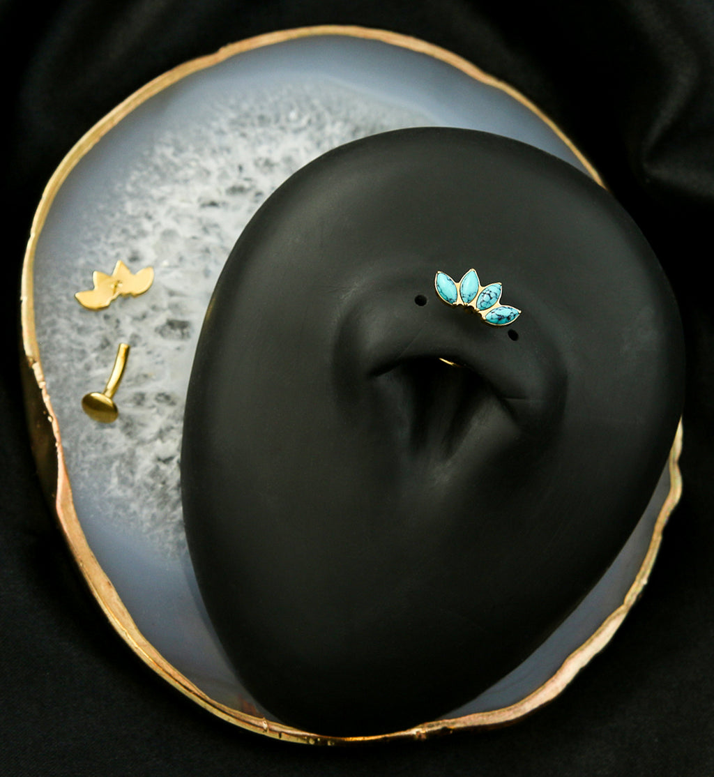This golden 14G Howlite belly button ring is a fun piece to add to your rotation. It features four synthetic oval Turquoise stones on the top. The top piece measures about 11mm x 5mm and has a wearable area of 5/16" (8mm). It is made from gold pvd on ASTM F-136 titanium. The threadless push pin closure is secured with an arched. The bottom disc measures about 5mm. Sold individually (1pc). Recommended for healed piercings.