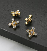 Internally threaded top piece made of gold pvd on ASTM F-136 titanium with clear cz gems in a quincunx shape. Choose your size from 16G and 14G. Overall size is 7.4mm x 7.4mm x .29mm. Sold individually.