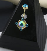 Regal looking belly button ring with a sparkling design made from rainbow aurora and aqua cz gems! Size is 14G with a 3/8" 10mm barbell. It is made from gold pvd on 316L stainless steel. Internally threaded. Top aqua cz measures at about 6mm. Bottom design is about 10mm. Sold individually (1 pc). For healed piercings.