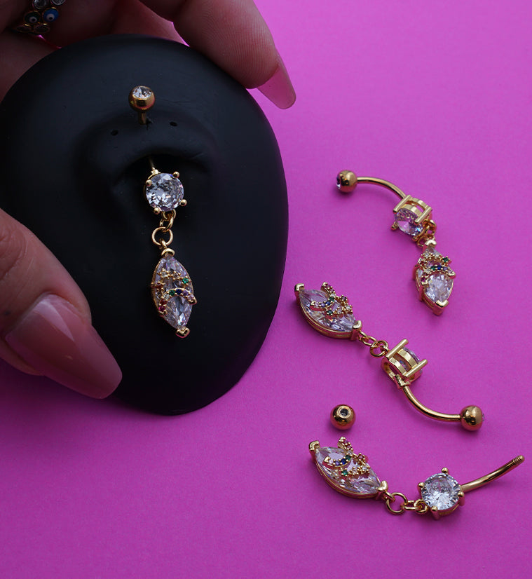 Gold PVD Rainbow CZ Oval Dangle Stainless Steel Belly Button Ring