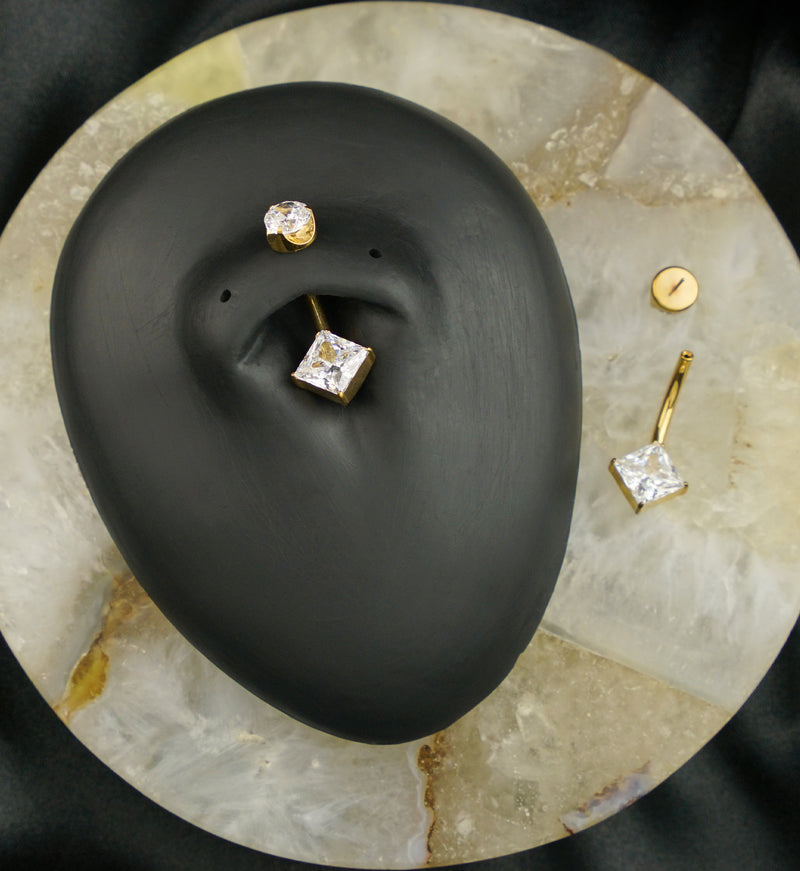 This golden belly button has a square, clear cz gem on the bottom and a round, clear cz gem on top. It is made from gold pvd on ASTM F-136 titanium and is threadless with a 25G pin. The threadless design makes this piece easy to put in and take out from your piercing. The size is 14G with a 3/8" (10mm) wearable length. The top gem measures 5mm and the bottom gem measures 6mm. Sold individually.