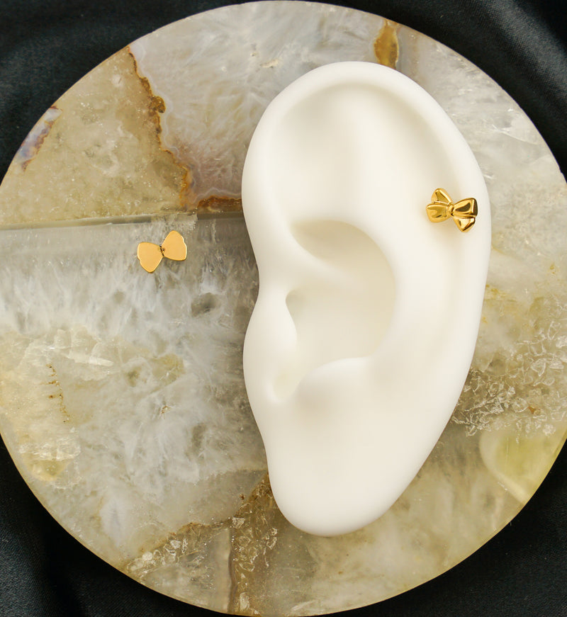 This ribbon bow top for threadless piercings is made of golden titanium with a size of 8mm x 6mm. The pin, at 25G, is compatible with most threadless tops. The gold pvd coating adds a touch of glam. Quick to put on and take off. Sold individually - top only!