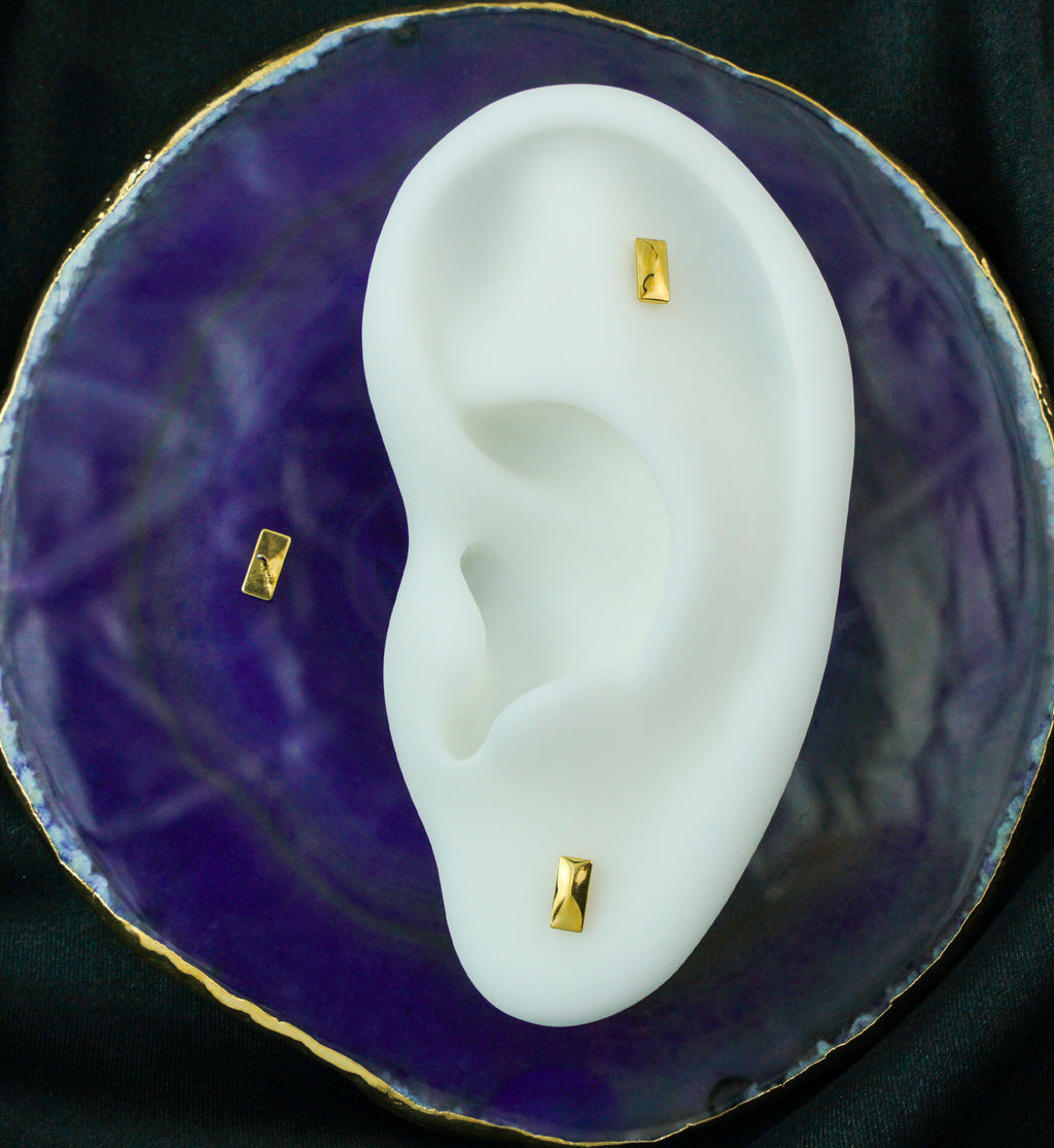 Made with high-quality ASTM F-136 titanium with gold pvd, this top has a rounded rectangle design. It is sold individually and fits most threadless posts. Its 5mm x 2mm size and 25G pin make it perfect for various piercings.