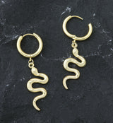 Hoop-style earrings with a dangling snake attached. Hinged clasp is made from gold pvd on 316L stainless steel. Size is 18G. Diameter is 1/2" (12mm). Total length is approximately 50mm. The hinged design is easy to open and close. Sold in pairs (2 pieces).
