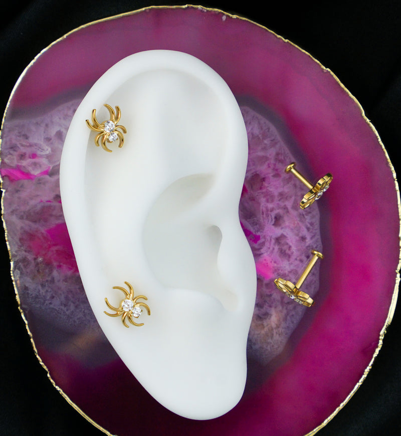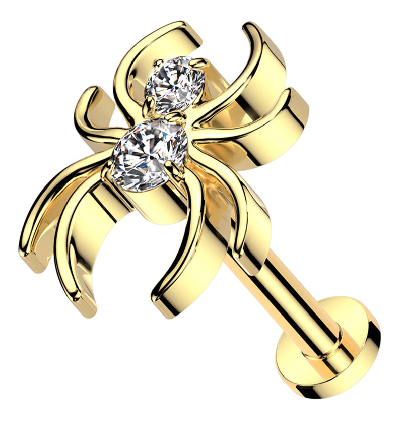 Golden threadless labret option that has a spider design that is accented with clear cz gems. The design measures about 10mm x 8mm. It is made from gold pvd on ASTM F-136 titanium and has a 25G pin and 3mm flat back. Sold individually, it is available in size 16G with either a 1/4" (6mm) or 5/16" (8mm) wearable length to choose from. Amazing labret piece for cartilage or tragus piercings!