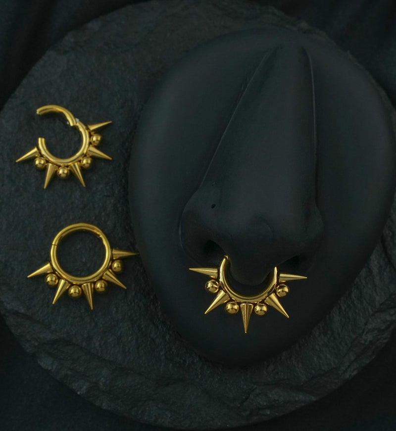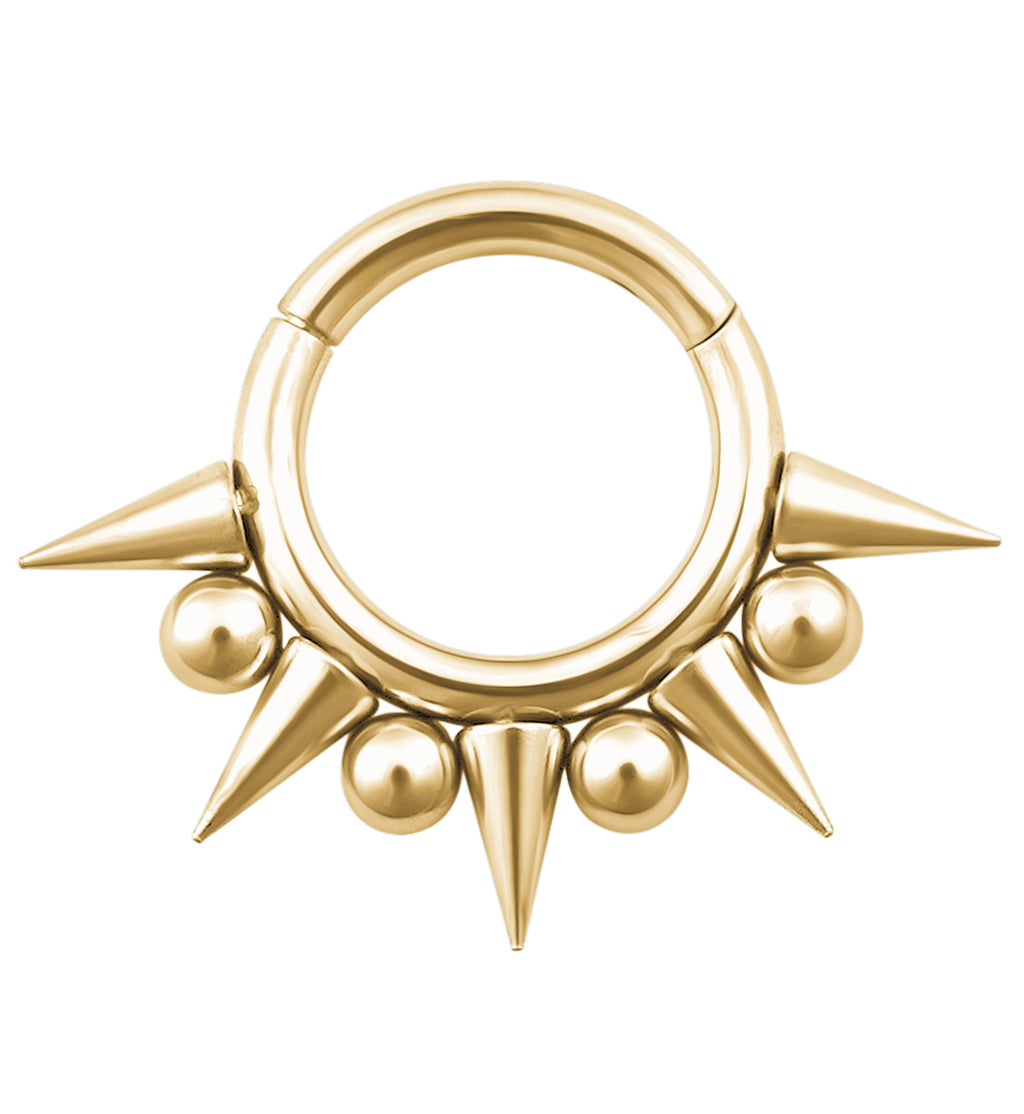 Get edgy with our Gold PVD Spike And Ball Stainless Steel Hinged Segment Ring. Sold individually, this 12G ring is made from gold pvd on 316L Stainless Steel and features a hinged segment for easy opening and closing. Great for healed piercings, the inner diameter sizes of 5/16" (8mm) and 3/8" (10mm) make it great for septum piercings.