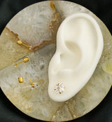 Golden, stud earrings with a square, clear cz gem on top. The backing is a 5mm, textured, cylinder. Made with gold pvd on 316L stainless steel. Size is 20G with an inner length of 1/4" (6mm). Choose your gem size from 3mm, 4mm, 5mm, 6mm, or 7mm! Sold in pairs (2pcs).