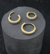 Hinged segment ring made from gold pvd on 316L stainless steel with a side-facing, square, clear cz row design. Size is 16G. Choose your inner diameter size from 5/16" (8mm), 3/8" (10mm), and 1/2" (12mm). The hinged design makes this piece easy to insert and remove. Sold individually (1pc).