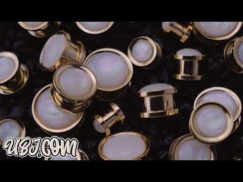Shining plugs made from gold pvd on 316L stainless steel. In the center is a pretty, white mother of pearl shell. Pick from 2G-5/8". Full length is 11mm with a wearable area of 6mm. Sold in pairs (2pcs). For healed lobes.
