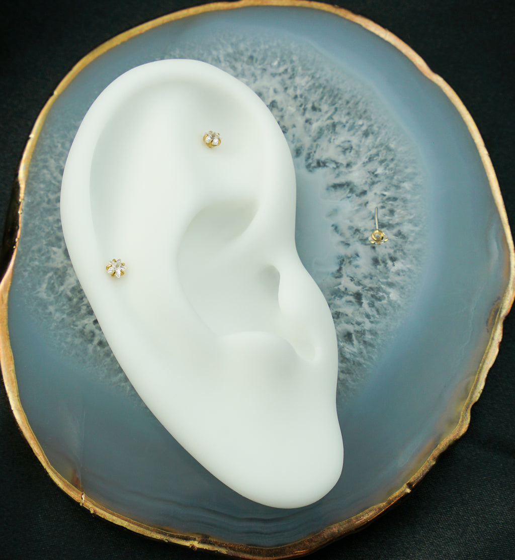 Made from gold pvd on ASTM F-136 titanium, this threadless top piece has a sparkling, star-shaped, clear cz gem in a prong setting. The star gem size is about 3mm. This top has a threadless design and fits most threadless posts for an effortless fit. Sold individually (1pc).
