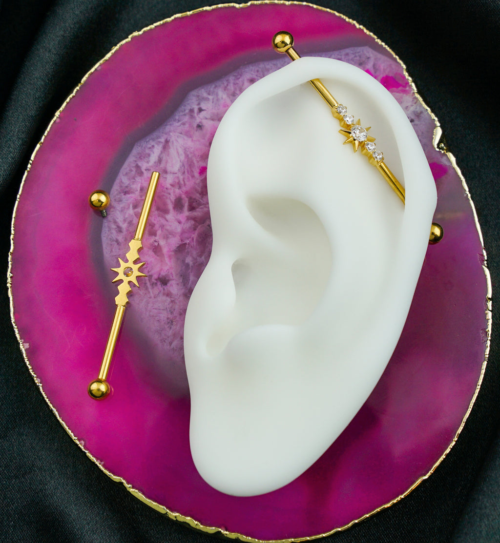 This golden industrial barbell is made from gold pvd on ASTM F-136 titanium and has centered, star design that is accented with clear cz gems. The size is 14G with a wearable length of 1 & ½”(38mm) and the balls ends are internally threaded and measure 4mm each. Sold individually.