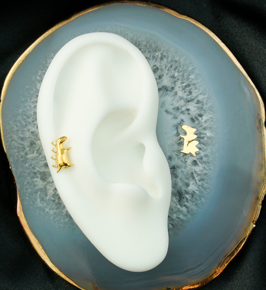 Made from gold pvd on ASTM F-136 titanium, this cute titanium threadless top has a stegosaurus dinosaur design that has triangle clear cz gems lining its back. The design size is approximately 10mm. This top piece has a threadless design and fits most threadless posts for an effortless fit. Sold individually (1pc).