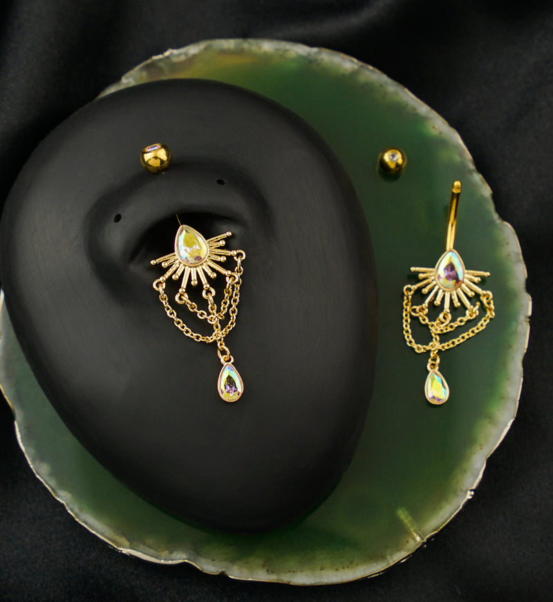 Colorful belly button ring that has a teardrop rainbow aurora cz gem on the bottom with an attached sunburst looking design surrounding the bottom of the gem. Under that, there are multiple dangling chains and another teardrop rainbow aurora cz gem dangle attached. On top, there is a bezel set, 5mm rainbow aurora cz gem. The belly ring has a wearable length of 3/8" (10mm) and a size of 14G. Overall, the design measures 28mm x 14mm (including dangles). It is made from gold pvd on surgical 316L stainless steel and is externally threaded with M1.2 threading. Meant for healed piercings. Sold individually.