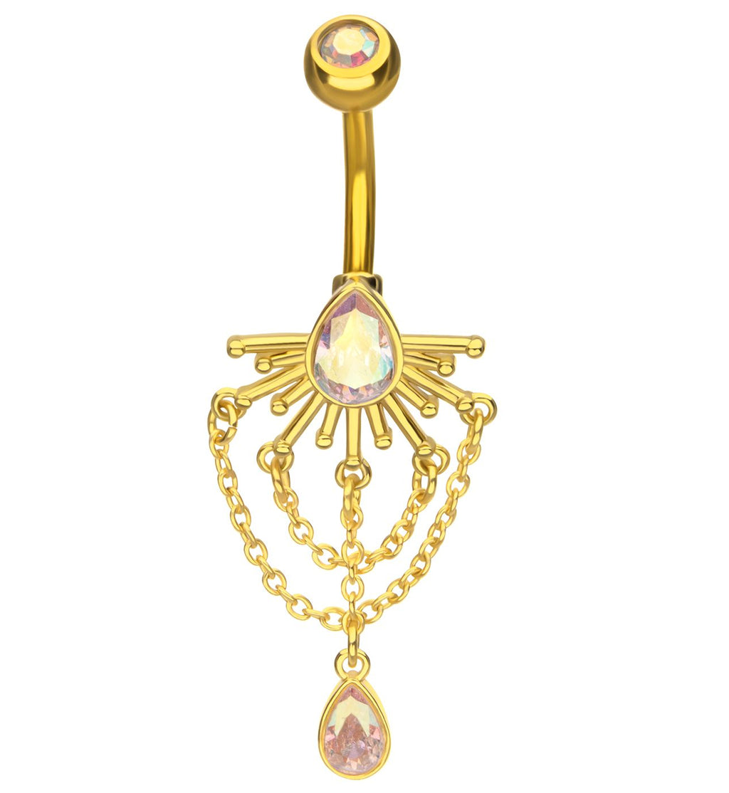 Gold PVD Sunrays Teardrop Rainbow Aurora CZ Dangle Chain Stainless Steel Belly Button Ring