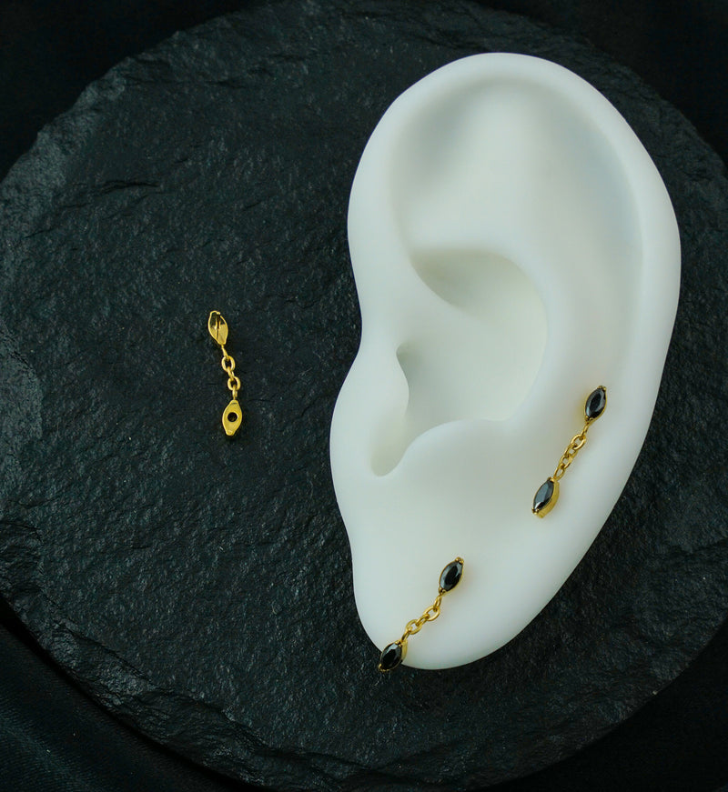 This stylish top is made of high-quality ASTM F136 titanium with a beautiful gold PVD finish and striking black CZ gems. Its 25G pin makes it a perfect fit for most threadless posts, and its teardrop chain link design adds a unique touch to your cartilage or tragus piercings. Sold individually.