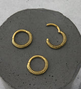 Hinged segment ring made from gold pvd on 316L stainless steel and a coil design along the bottom. Size: 16G. Diameter size: 5/16" (8mm). The hinged design makes this piece easy to insert and remove. Sold individually (1pc).