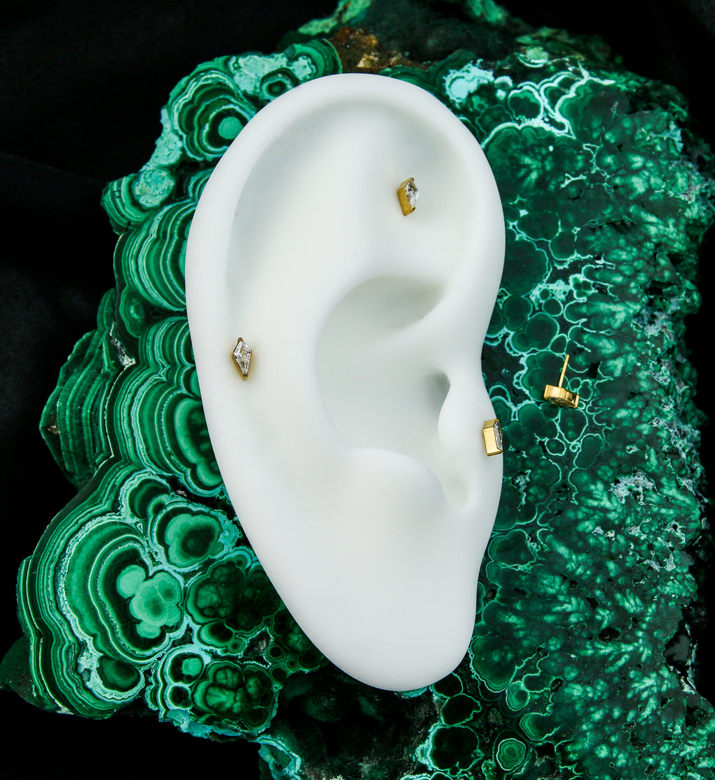 Gold PVD threadless top piece that has a kite clear cz design with a long point. Made from gold pvd on ASTM F-136 titanium. Measures about 5mm x 3mm. 25G pin. Fits most threadless posts. Sold individually (top piece only). A golden top piece to add to your collection.