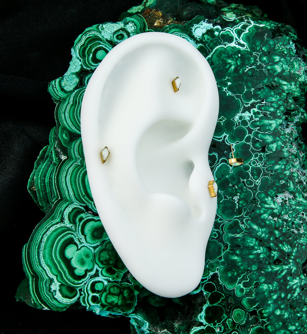 This Gold PVD Tetra threadless top piece makes the perfect staple piece to add to your collection. It's look is very versatile while still helping elevate the look you are going for. It has a kite like design. Features a synthetic blue opalite. Made from Gold pvd on ASTM F-136 titanium. Measures about 5mm x 3mm. 25G titanium pin. Fits most threadless posts. Sold individually (top piece only).
