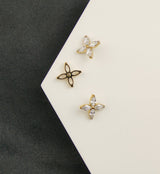 This golden, internally threaded top piece has four, marquise, clear cz gems on top that create a four petal flower appearance. Size is 16G so it will fit on both 16G and 14G size labrets. The top size is about 7mm. It is made from 24kt gold pvd on ASTM F-136 titanium. Sold Individually - top only.