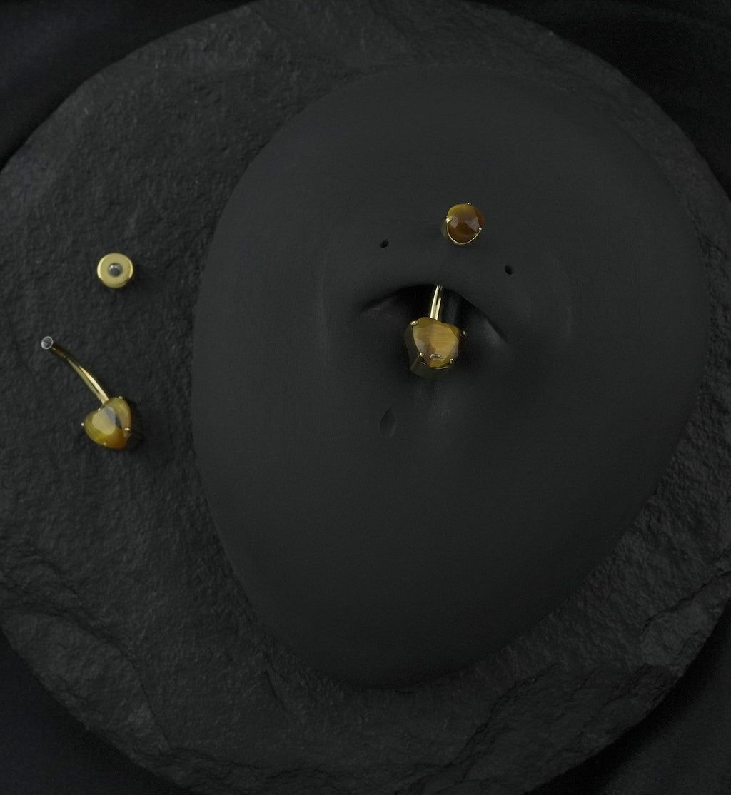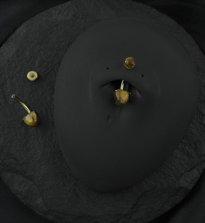 This golden belly button ring features a stunning bezel heart-shaped tiger eye stone that measures 6.5mm while the top stone measures 4mm. Available in 14g with a length of 3/8" (10mm). It's made from gold PVD titanium and features an internally threaded design making it perfect for those looking for both style and comfort. Sold individually.