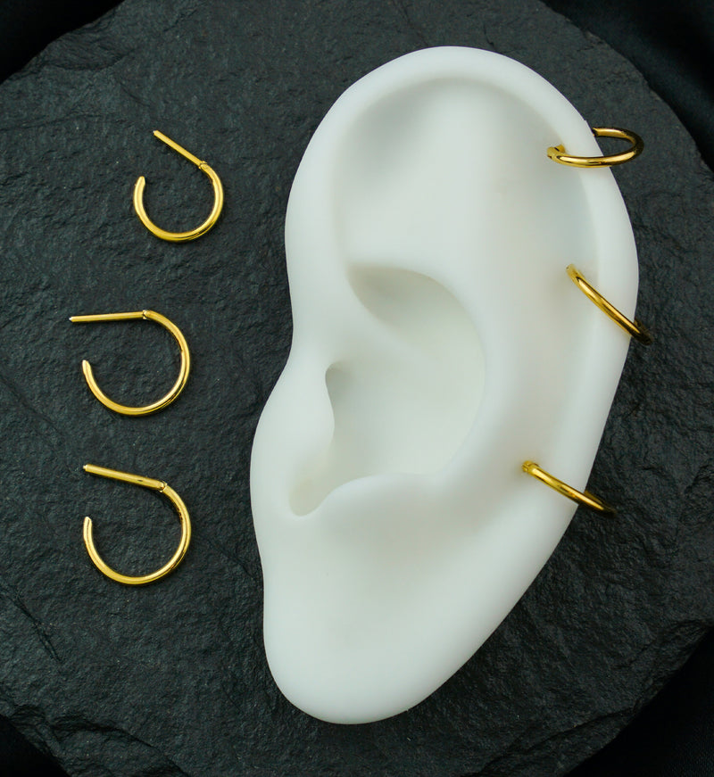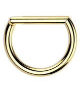 Golden, hinged segment ring made from gold pvd on ASTM F-136 titanium with a d-shaped hoop design. Size is 18G or 16G with an inner diameter size of 1/4" (6mm), 5/16"(8mm), 3/8" (10mm), 7/16" (11mm). The hinged design makes this piece easy to put in and take out. Great for septum, cartilage piercings! Sold individually. For healed piercings.