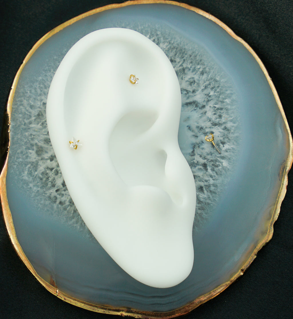 Made from gold pvd on ASTM F-136 titanium, this threadless top piece has a triangle-shaped, clear cz gem in a prong setting. Gem size measures 3mm. This top has an easy, threadless design and fits most threadless posts. Sold individually.