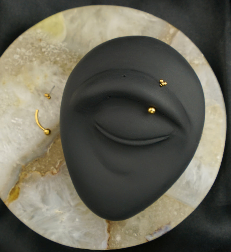 Golden, curved barbells decorated with a small, triple bead design on top. The top piece has a threadless design that makes it easy to put in and remove. The top design measures 3mm. Made from gold pvd on ASTM F-136 titanium with an inner length of 5/16" (8mm) and a 16G size. Complete with a 3mm ball on the bottom. Sold individually. Golden jewelry piece for eyebrow or rook piercings!