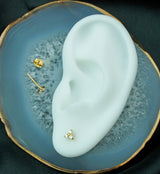 Stud earrings with a triple, prong-set, clear cz gem design on top. Made with gold pvd on ASTM F-136 titanium. Size is 20G with a length of about 1/2" (12mm) and a wearable of about 1/4" (6mm). Each piece has a stud design with a butterfly back. Top design measures about 6mm. Sold in pairs (2pcs).