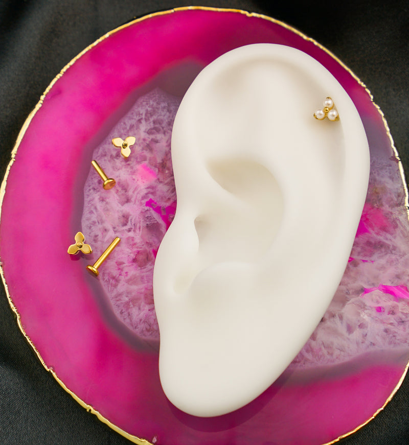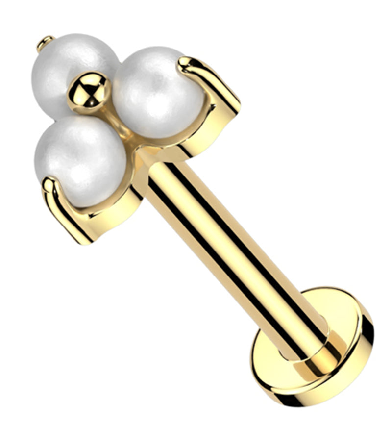 This golden, internally threaded labret has a triple synthetic pearl gem design on top. The disc on the end measures at 4mm. For healed piercings. Size is 16G and you can pick from two different wearable lengths: 1/4" (6mm) or 5/16" (8mm). The top size is about 5mm. It is made from gold pvd on ASTM F-136 titanium. Sold Individually.