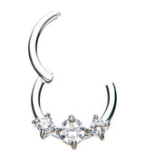 This 16G hinged segment ring is crafted with Gold PVD on 316L stainless steel and features 3 sparkling Clear CZ gems. The segment opens for easy wearing and its 5/16" (8mm) inner diameter makes it perfect for septum or cartilage piercings. Recommended for healed piercings.