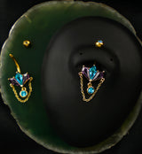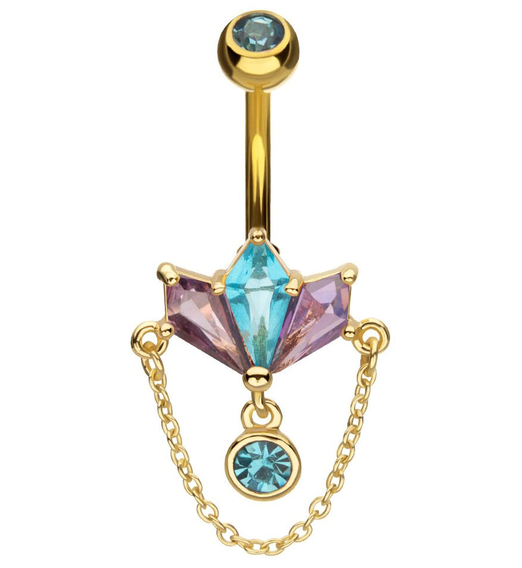Funky belly button ring that has a triple poly design with alternating amethyst and aqua gems that has an attached, dangling, aqua cz gem and a chain as an accent. The belly ring has a wearable length of 3/8" (10mm) and a size of 14G. Overall, the design measures 20mm x 16mm (including dangles). It is made from gold pvd on 316L stainless steel and is externally threaded with M1.2 threading. Meant for healed piercings only. Sold individually.