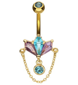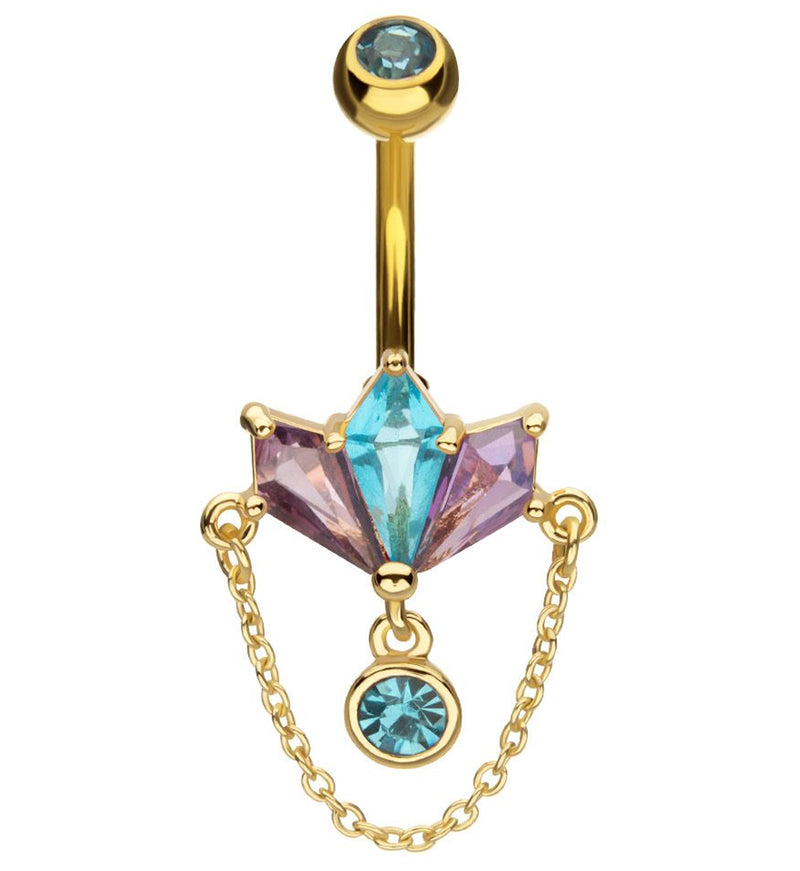 Gold PVD Triple Poly Amethyst And Aqua CZ Dangle Chain Stainless Steel Belly Button Ring