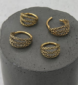 Hinged segment ring made from gold pvd on 316L stainless steel with a round shape and three rows of scale-like texture. Size is 16G. Choose your inner diameter size: 5/16" (8mm), 3/8" (10mm). The hinged design makes this piece easy to insert and remove. Sold individually (1pc). For healed piercings.