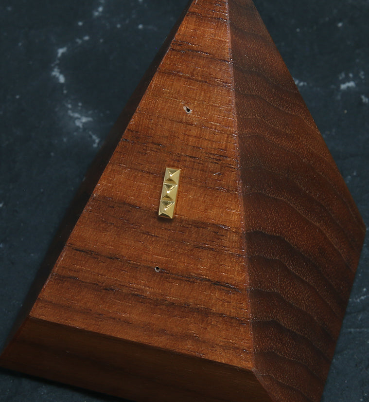 Studded threadless top piece that has a rectangular design consisting of three pyramid points. Made from gold pvd on ASTM F-136 titanium. Measures about 8mm x 2.5mm. Fits most threadless posts. Sold individually (top piece only).