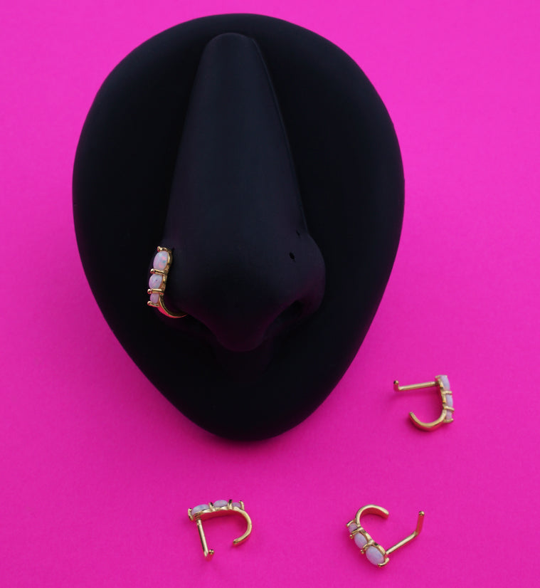 This Gold PVD Triple White Opalite Nose Curve is made with gold pvd on 316L stainless steel and synthetic white opal gems for a stunning and eye-catching look. It features a length of 5/16" (8mm) and is 18G in size. Sold individually (1 pc).