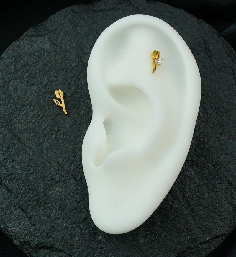 Threadless top piece with a tulip flower design, complete with a marquise clear cz gem as the leaf. Made from gold pvd ASTM F-136 titanium. Measures about 10mm x 5mm. Fits most threadless posts as it has a 25G pin. Golden piece for your cartilage or tragus piercing! Sold individually (top only).