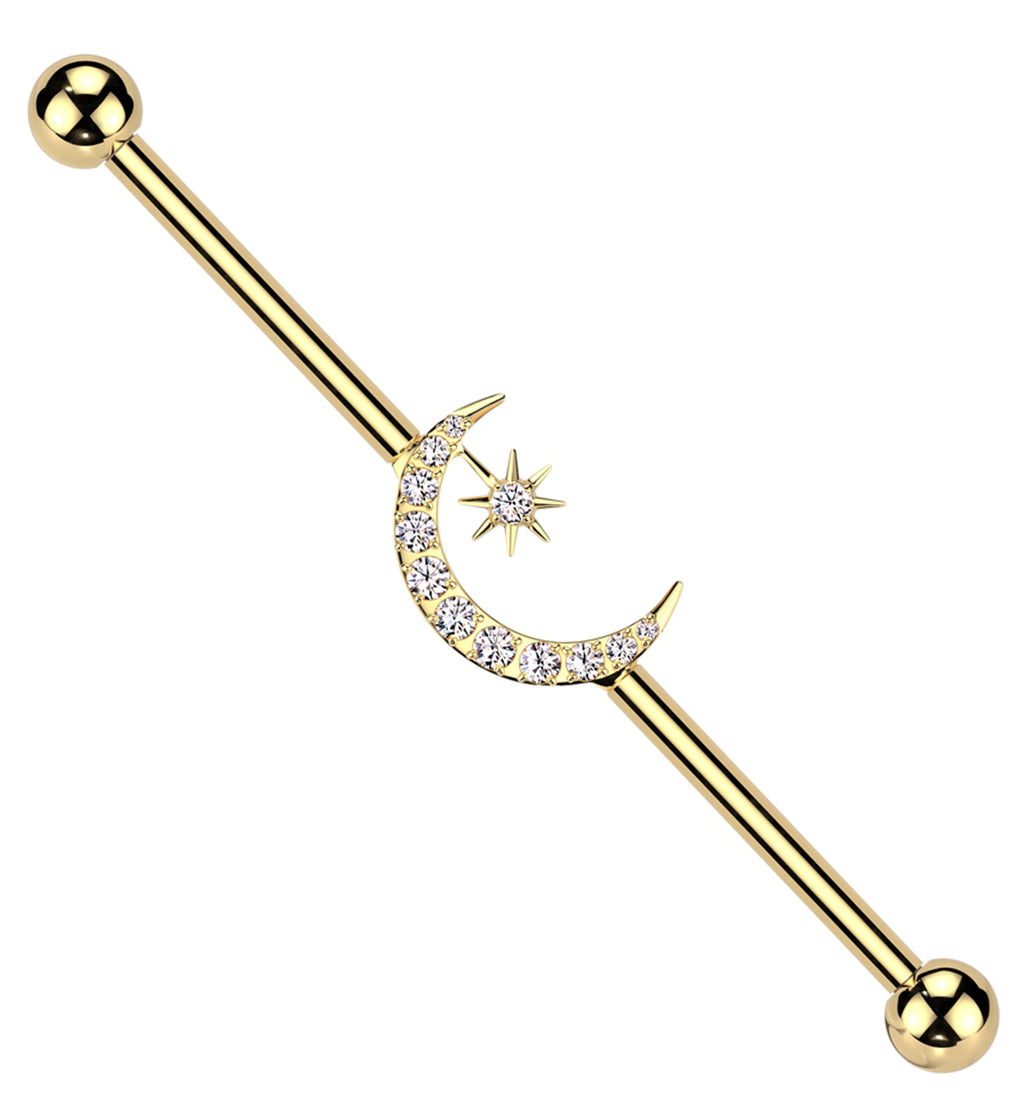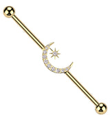 Gold PVD Twilight Moon And Star Clear CZ Internally Threaded Titanium Industrial Barbell