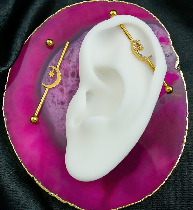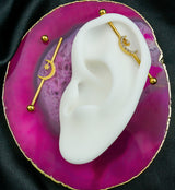 This pretty, straight barbell is made from gold pvd on ASTM F-136 titanium and has a crescent moon design that is accented with clear cz gems and a little star accent. The size is 14G with a wearable area of 1 & ½”(38mm) and the balls ends are internally threaded and measure 4mm each. For healed piercings. Sold individually.
