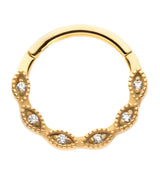 Golden hinged segment ring made from gold pvd on 316L stainless steel with a twisted, beaded marquise clear cz design. Size is 16G. Choose your inner diameter size: 5/16" (8mm), 3/8" (10mm). The hinged design makes this piece easy to insert and remove. Sold individually (1pc).