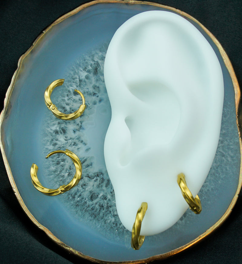 These hoop shaped earrings have a twisted design and are made from gold pvd on 316L stainless steel. They are size 18G with an inner diameter of either 5/16" (8mm) or 3/8" (10mm) to choose from. Total length is approximately 12mm - 14mm. The hinged design is easy to open and close. Sold in pairs (2 pcs). For healed piercings.