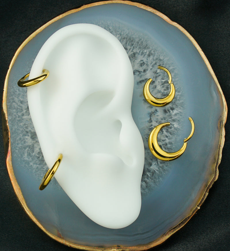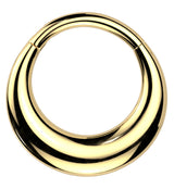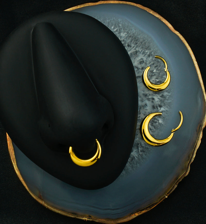 This golden, hinged segment ring has a flat, broad bottom design. It is made up of gold pvd on 316L stainless steel. Wearable size is either 5/16" (8mm) or 3/8" (10mm) with a gauge size of 16G. The hinged design makes this piece easy to insert and take out. Sold individually. For healed piercings.