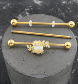 Add beautiful sparkle to your industrial piercing with this golden industrial barbell! The straight barbell is constructed from 316L stainless steel with gold PVD coating and a 6mm synthetic white opal gem that is encircled with two leaf designs that are filled with sparkling clear cz gems. Silicone rings are attached behind the charm making it adjustable. 5mm ends and external threading keep wear and removal easy. Sold individually.
