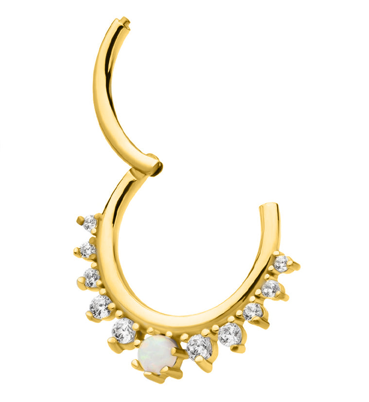 Hinged segment ring made from gold pvd on 316L stainless steel with a hoop design that has clear cz gems along the bottom with a centered 3mm white opalite gem. Size is 16G with an inner diameter size of either 5/16" (8mm) or 3/8" (10mm). The hinged design makes this piece easy to insert and remove. Sold individually (1pc).